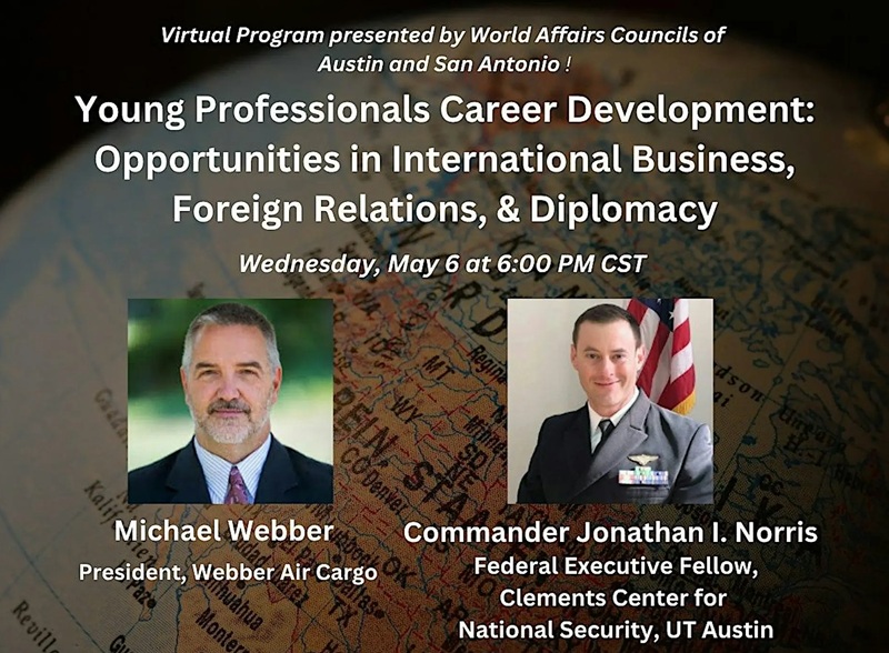 Join the World Affairs Council of Austin & San Antonio for a program on Future Careers in Foreign Service and Global Logistics! Featured speakers Navy FAO Plans & Requirements Chief, Jonathan Norris, and President of Webber Air Cargo, Michael Webber will share their fascinating journey’s and what it means to navigate highly complex scenarios in […]