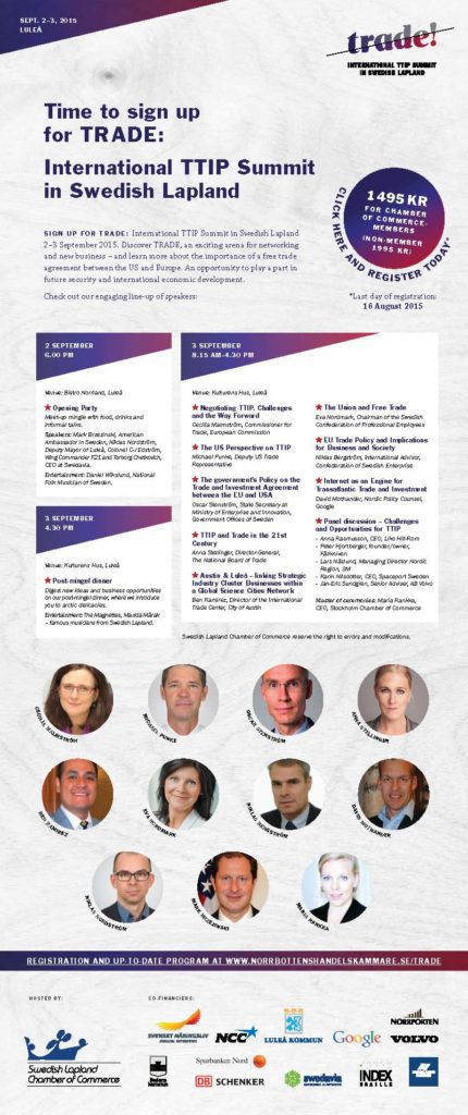 Over the past few years, trans-Atlantic business exchanges with northern Sweden have included visits to central Texas by Luleå’s Mayor Niklas Nordström. Mayor Nordström conceived of this TTIP Summit as part of his strategy to “bring the world to Luleå.” He certainly succeeded in this objective. Summit attendees included representatives of small and large companies like Google; 3M and TCO, joined by government officials like Michael Punke, Deputy U.S. Trade Representative; Inger Pedersen, CEO, Norrbotten Region Chamber of Commerce; and Cecilia Malmström, Commissioner for Trade, European Commission.